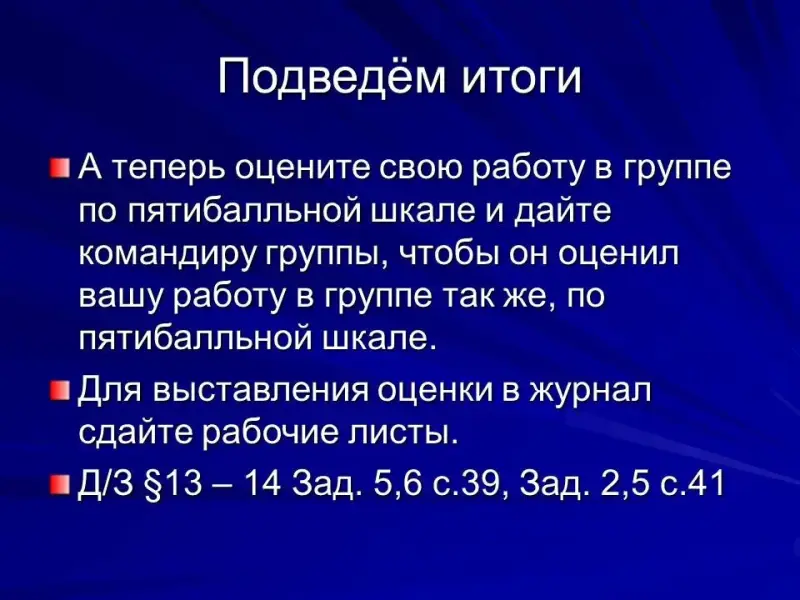 Пожалуйста, выставите себе оценки (по пятибалльной системе) в рабочий лист. Затем отдайте рабочий лист командиру группы, чтобы он также выставил вам оценку за работу в группе.