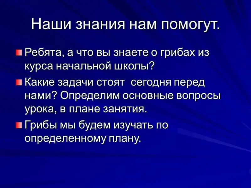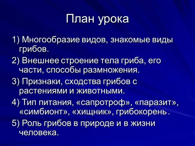 - Обучающая - изучить общие особенности организации грибов (многообразие видов, признаки, тип питания, способы размножения, роль в природе), отличающие их от организации других царств живой природы (растения, животные).