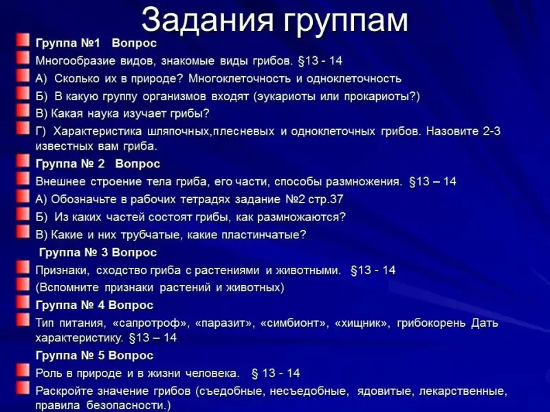 Для работы мы разделимся на 5 групп и каждая группа в ходе работы может пользоваться карточкой-определителем "Самые распространенные съедобные грибы". Таблицей «Строение тела шляпочного гриба»), На экране каждая группа найдет вопрос для неё. Ребята, Вопросы для групп - это пункты нашего плана. (Слайд №6)