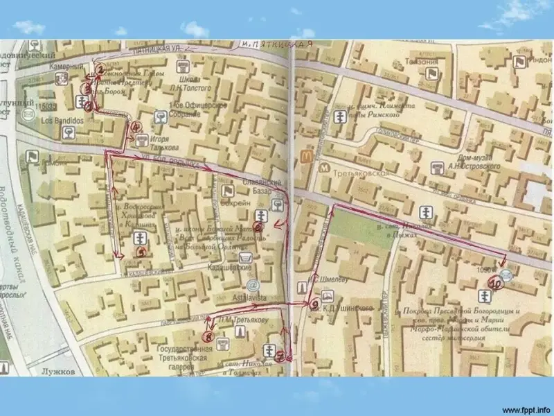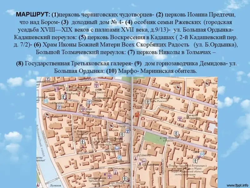 МАРШРУТ: церковь черниговских чудотворцев - церковь Иоанна Предтечи, что над Бором - доходный дом № 4 - особняк семьи Ржевских (городская усадьба XVIII-XIX веков с палатами XVII века, д.9/13) - ул. Большая Ордынка - Кадашевский переулок: церковь Воскресения в Кадашах (2-й Кадашевский пер. д. 7/2) - Храм Иконы Божией Матери Всех Скорбящих Радость (ул. Б.Ордынка), Большой Толмачевский переулок: церковь Николы в Толмачах - Государственная Третьяковская галерея - дом горнозаводчика Демидова - ул. Большая Ордынка: Марфо-Мариинская обитель.