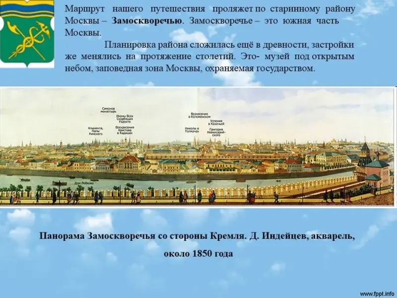 Маршрут нашего путешествия проляжет по старинному району Москвы - Замоскворечью. Замоскворечье - это южная часть Москвы.< /p>