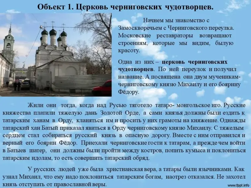 Одна из них - церковь черниговских чудотворцев. По ней переулок и получил название. А посвящена она двум мученикам - черниговскому князю Михаилу и его боярину Фёдору.