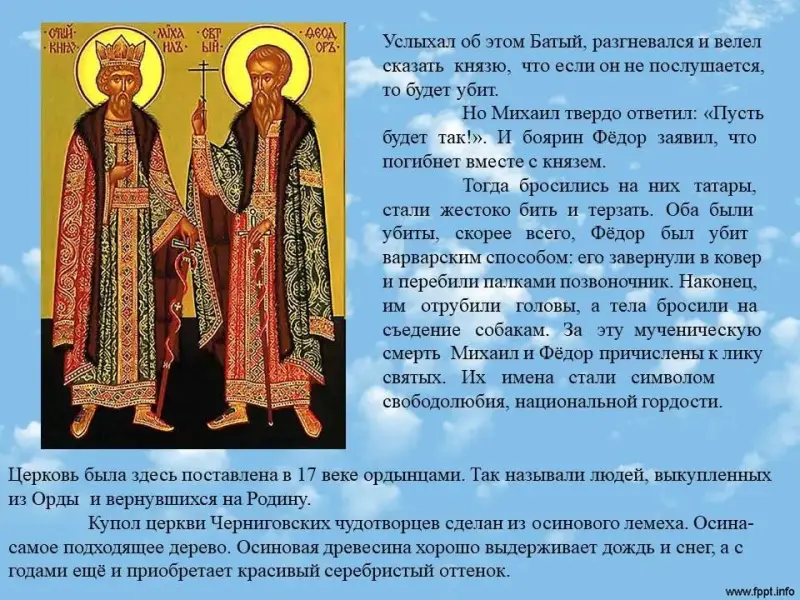 Жили они тогда, когда над Русью тяготело татаро-монгольское иго. Русские княжества платили тяжелую дань Золотой Орде, а сами князья должны были ездить к татарским ханам в Орду, кланяться им и просить у них грамоты на княжение. Однажды татарский хан Батый приказал явиться в Орду черниговскому князю Михаилу. С тяжелым сердцем стал собираться русский князь в опасную дорогу. Вместе с ним отправился и верный его боярин Фёдор. Приехали черниговские гости к татарам, а прежде чем войти в Батыев шатер, они должны были пройти между костров, попить кумыса и поклониться татарским идолам, то есть совершить татарский обряд.