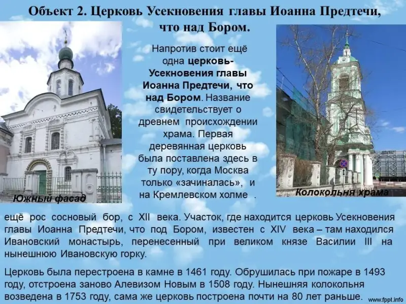 поставлена здесь в ту пору, когда Москва только «зачиналась», и на Кремлевском холме ещё рос сосновый бор, с XII века. Участок, где находится церковь Усекновения главы Иоанна Предтечи, что под