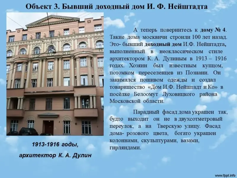 А теперь повернитесь к дому № 4. Такие дома москвичи строили 100 лет назад. Это - бывший доходный дом И.Ф. Нейштадта, выполненный в неоклассическом стиле архитектором К.А. Дулиным в 1913-1916 годах. Хозяин был известным купцом, потомком переселенцев из Познани. Он занимался пошивом одежды и создал товарищество «Дом И.Ф. Нейштадт и Ко» в посёлке Белоомут Луховицкого района Московской области. Парадный фасад дома украшен так, будто выходит он не в двухсотметровый переулок, а на Тверскую улицу. Фасад дома богато украшен колоннами, скульптурами, вазами, гирляндами.