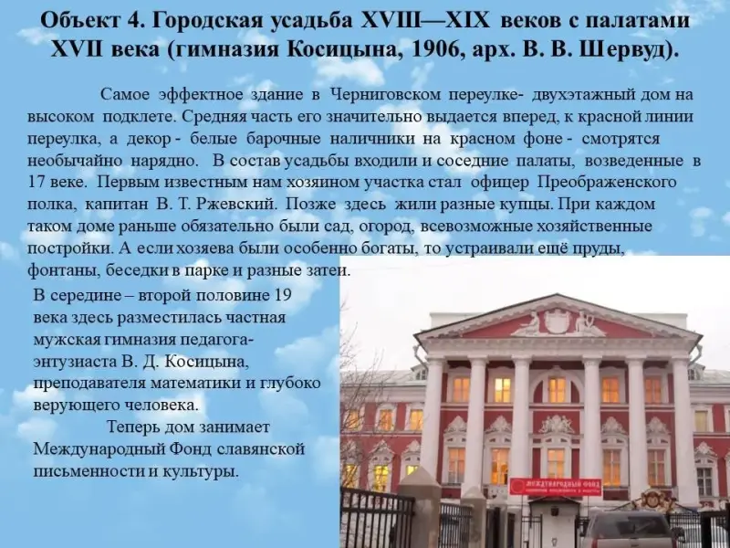 Дом № 9/13 - Самое эффектное здание в Черниговском переулке- двухэтажный дом на высоком подклете. Средняя часть его значительно выдается вперед, к красной линии переулка, а декор - белые барочные наличники на красном фоне - смотрится необычайно нарядно. Пространственная структура четко указывает - это был главный дом солидной усадьбы - обновленный нарядный дворец с лепными барельефами и стройными дорическими портиками. До революции здесь была известная гимназия Косицына, а когда-то городская усадьба конца 18 - начала 19 века. В состав усадьбы входили и соседние палаты, возведенные в 17 веке. Первым известным нам хозяином участка стал офицер Преображенского полка, капитан В.Т. Ржевский. Именно он в 1710 году выстроил палаты, лежащие в основе главного корпуса здания. Как выглядел тогда дом, можно понять, взглянув на дворовый фасад, где раскрыты декоративные детали XVIII столетия.