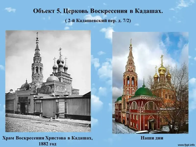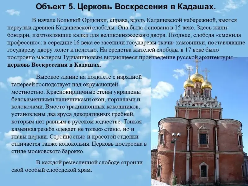 В начале Большой Ордынки, справа, вдоль Кадашевской набережной, вьются переулки древней Кадашевской слободы. Она была основана в 15 веке. Здесь жили бондари, изготовлявшие кадки для великокняжеского двора. Позднее, слобода «сменила профессию»: в середине 16 века её заселили государевы ткачи - хамовники, поставлявшие государеву двору холст и полотно. На средства жителей слободы в 17 веке было построено мастером Турчаниновым выдающееся произведение русской архитектуры - церковь Воскресения в Кадашах (2-й Кадашевский пер. д. 7/2).