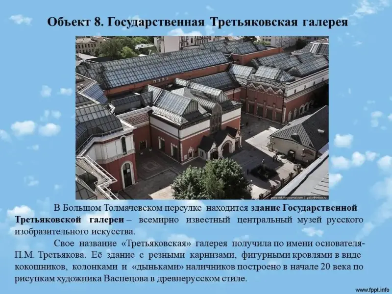 Свое название «Третьяковская» галерея получила по имени основателя - П.М.Третьякова. Её здание с резными карнизами, фигурными кровлями в виде кокошников, колонками и «дыньками» наличников построено в начале 20 века по рисункам художника Васнецова в древнерусском стиле.