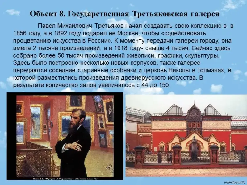 Павел Михайлович Третьяков начал создавать свою коллекцию в 1856 году, а в 1892 году подарил ее Москве, чтобы «содействовать процветанию искусства в России». К моменту передачи галереи городу, она имела 2 тысячи произведений, а в 1918 году - свыше 4 тысяч. Сейчас здесь собрано более 50 тысяч произведений живописи, графики, скульптуры.