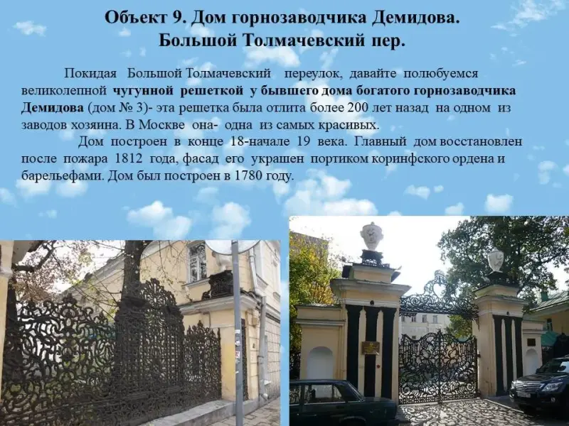 Покидая Большой Толмачевский переулок, давайте полюбуемся великолепной чугунной решеткой у бывшего дома богатого горнозаводчика Демидова (дом № 3) - эта решетка была отлита более 200 лет назад на одном из заводов хозяина. В Москве она - одна из самых красивых.
