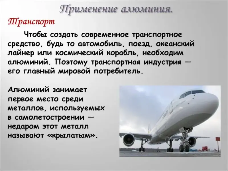 Одна из них - получение сплавов. Посмотрите, для чего использует человек сплавы алюминия (презентация). Сделайте необходимые записи в тетрадь.