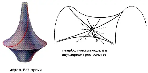 Возникает убеждённость, что эта теория, на самом деле непротиворечива, но надо было получить доказательство непротиворечивости, то есть построить модель. Построение такой модели выпало на долю математиков следующего поколения. Например, в 1868 году итальянский математик Э. Бельтрами исследовал вогнутую поверхность, называемую псевдосферой и доказал, что на этой поверхности действует геометрия Лобачевского. Также были предложены другие модели Ф. Клейном, А. Пуанкаре и др. <рисунок3>.