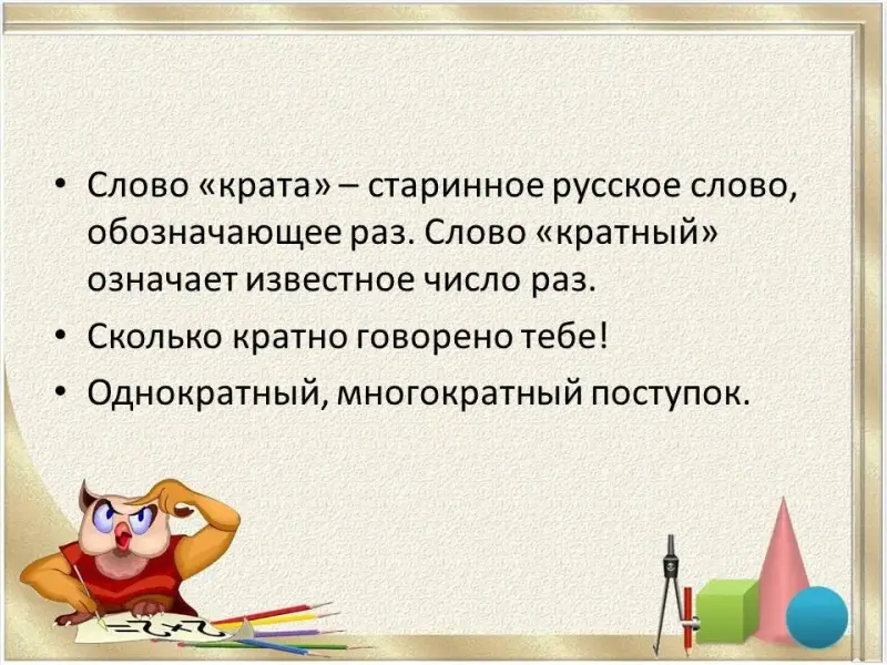 - Последовательно кратные данного числа можно получать, умножая его на 1, 2, 3 и т.д. или прибавляя данное число к предыдущему кратному.