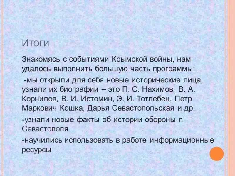 - Эссе: «Можно ли было избежать Крымской войны?», «Какое решение приняли бы вы на месте защитников Севастополя»,