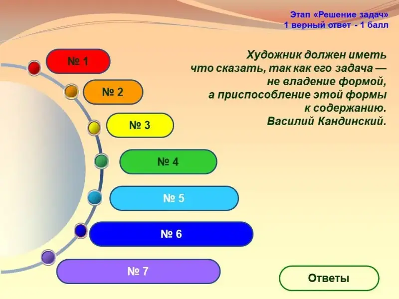 Закрепление изученного материала. Художник должен иметь что сказать, так как его задача - не владение формой, а приспособление этой формы к содержанию. Василий Кандинский. Вот и наша задача уметь приспособить теорию к решению задач. В музыке семь нот, в радуге семь цветов, а у нас семь задач. Но время на решение всех задач только 14 минут. Данный слайд можно использовать по усмотрению учителя: