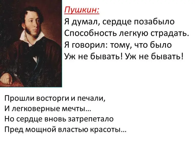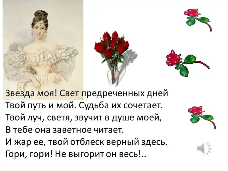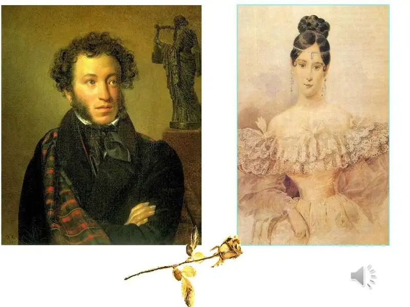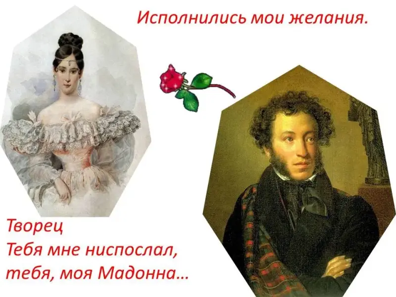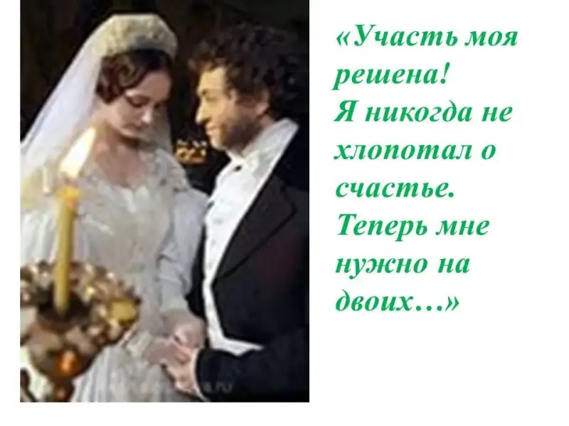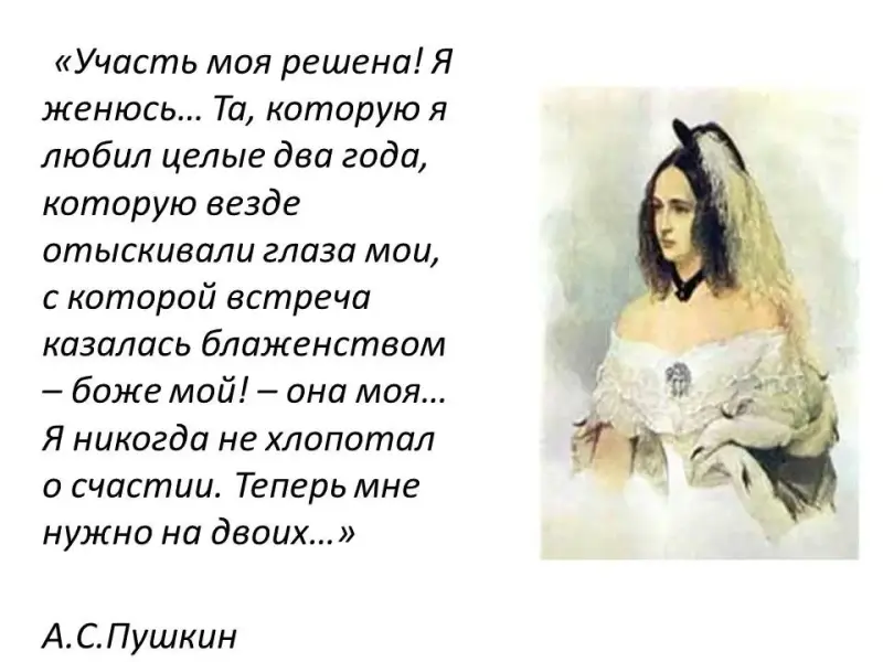 Пушкин. (Слайд 8-9-10) «Участь моя решена! Я женюсь… Та, которую я любил целые два года, которую везде отыскивали глаза мои, с которой встреча казалась блаженством - боже мой! - она моя… Я никогда не хлопотал о счастии. Теперь мне нужно на двоих…»