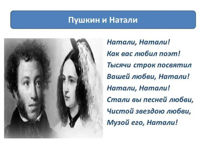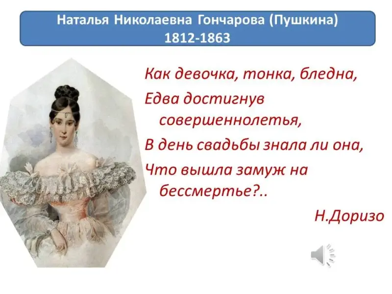Ведущая: (Слайд 6) С тех пор, как Пушкин шагнул навстречу Натали, для него не было ничего прекраснее и дороже ее. Он понял, что это прекрасное создание составит его счастье.