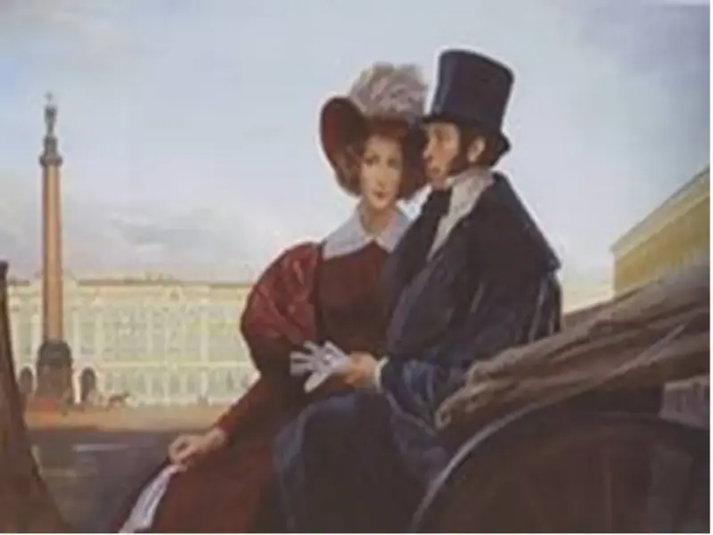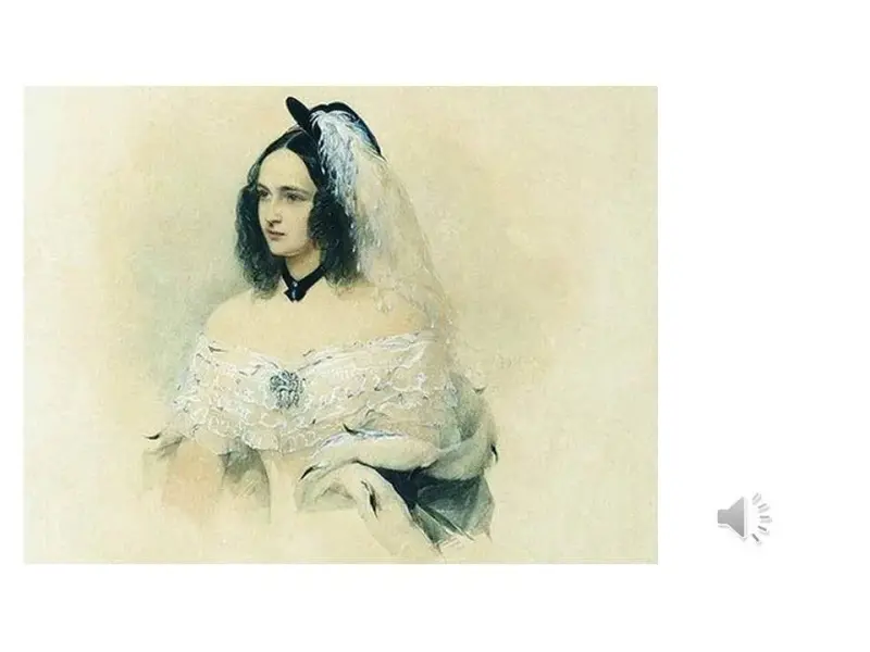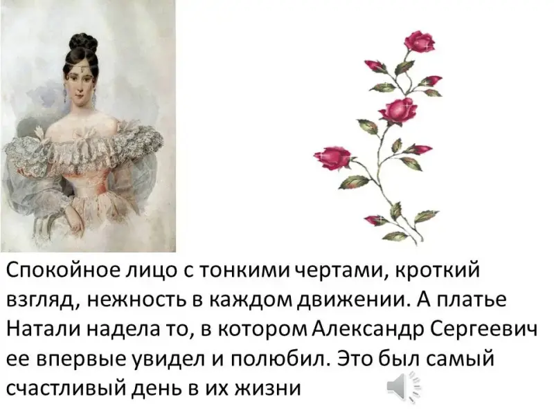 Ведущая. (Слайд 5) Спокойное лицо с тонкими чертами, кроткий взгляд, нежность в каждом движении. А платье Натали надела то, в котором Александр Сергеевич ее впервые увидел и полюбил. Это был самый счастливый день в их жизни.