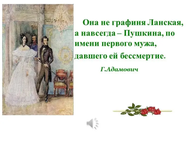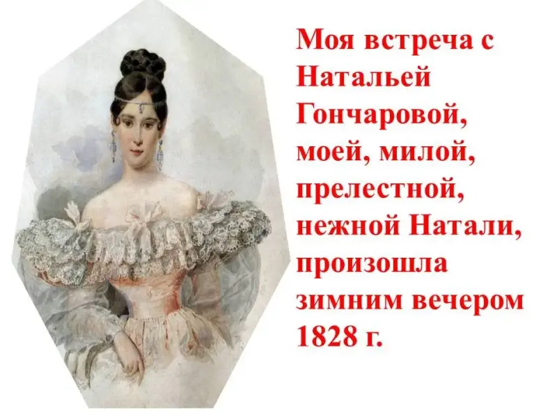 Пушкин: (Слайд 6) Моя встреча с Натальей Гончаровой, моей, милой, прелестной, нежной Натали, произошла зимним вечером 1828 г. на балу у танцмейстера Йогеля. Никогда еще с таким грустным чувством я не приезжал на бал. Тайное предчувствие томило меня и волновало душу. И вдруг какая-то сила заставила меня обернуться. Я увидел ее в прозрачном облаке воланов и кружев, в толпе молодых поклонников, в окружении многочисленной родни и знакомых… Я шагнул навстречу своей судьбе.
