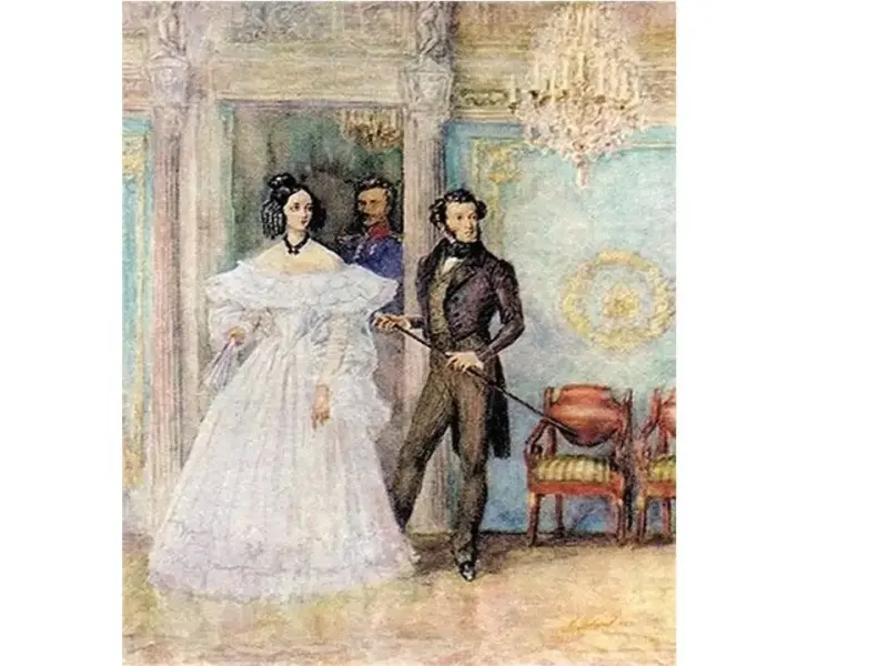 Пушкин выходит под руку с Натальей Николаевной Гончаровой, усаживает.