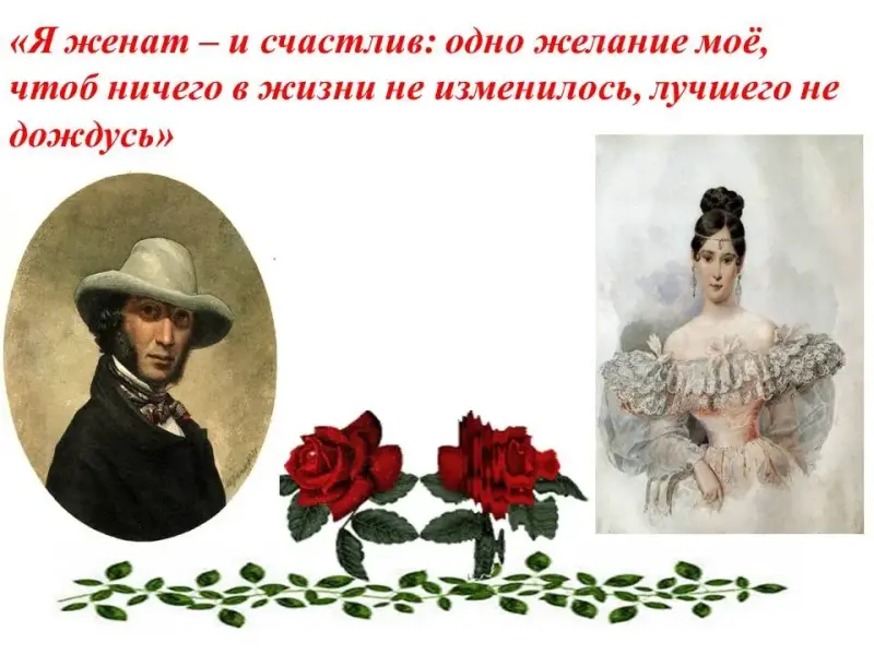 Пушкин: (Слайд 20) Я женат и счастлив. Одно желание мое, чтоб ничего в жизни моей не изменилось - лучшего не дождусь.
