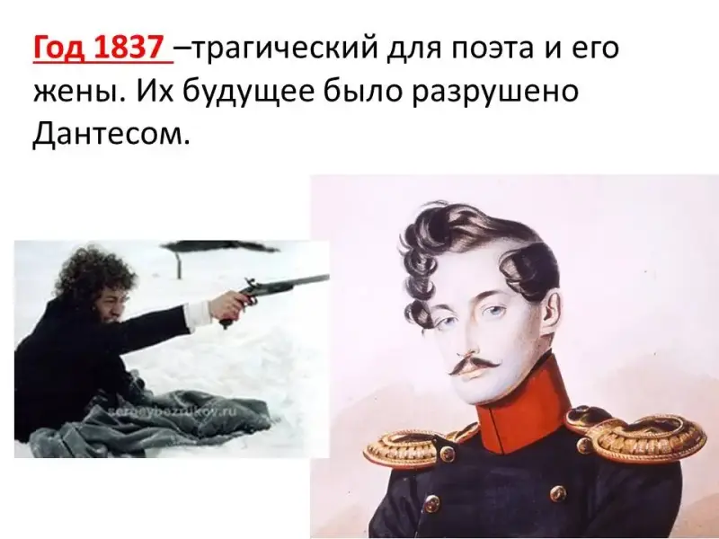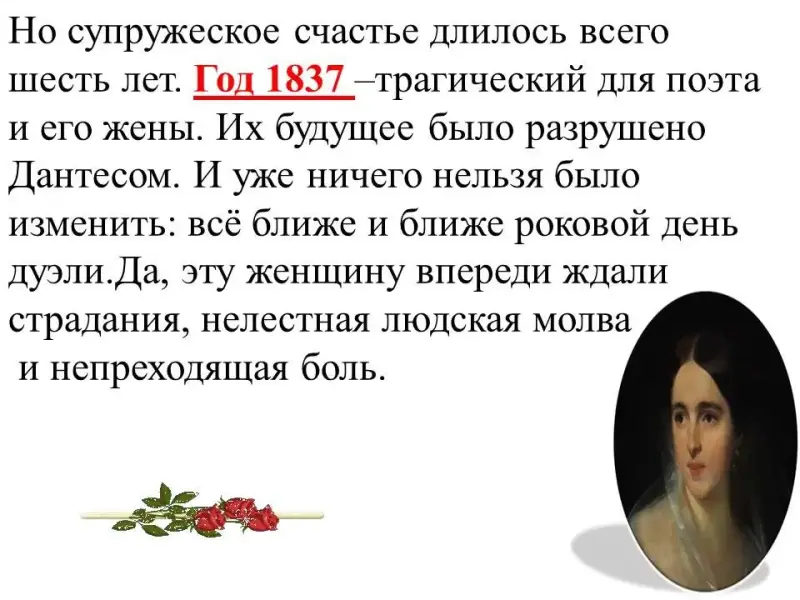 Ведущая: Слайд 22 Но супружеское счастье длилось всего шесть лет. Год 1837 - трагический для поэта и его жены. Их будущее было разрушено Дантесом. И уже ничего нельзя было изменить: всё ближе и ближе роковой день дуэли. Да, эту женщину впереди ждали страдания, нелестная людская молва и непреходящая боль.