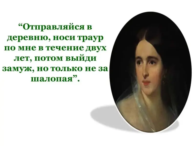 Пушкин: Отправляйся в деревню, носи траур по мне в течение двух лет, потом выйди замуж, но только не за шалопая.
