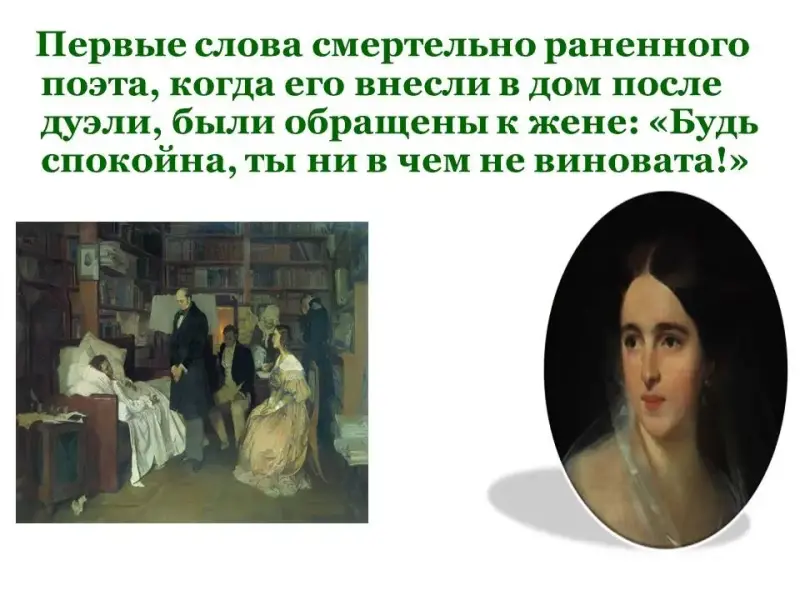Ведущая: Пушкин стрелялся с Дантесом. Рана оказалось смертельной. Умирая, испытывал величайшие муки, но несмотря на это, думал о других и прежде всего о семье. Он отдал мне последние распоряжения, снял с руки кольцо и попросил принять его на память. Простился с близкими, нашел в себе силы сказать слова утешения Наталье Николаевне.