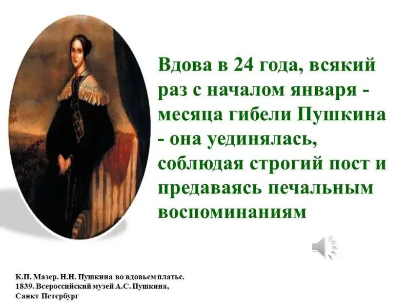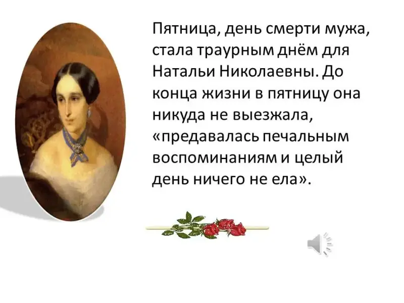 Ведущая: Вдова в 24 года, всякий раз с началом января - месяца гибели Пушкина - она уединялась, соблюдая строгий пост и предаваясь печальным воспоминаниям. Пятница, день смерти мужа, стала траурным днём для Натальи Николаевны. До конца жизни в пятницу она никуда не выезжала, «предавалась печальным воспоминаниям и целый день ничего не ела».