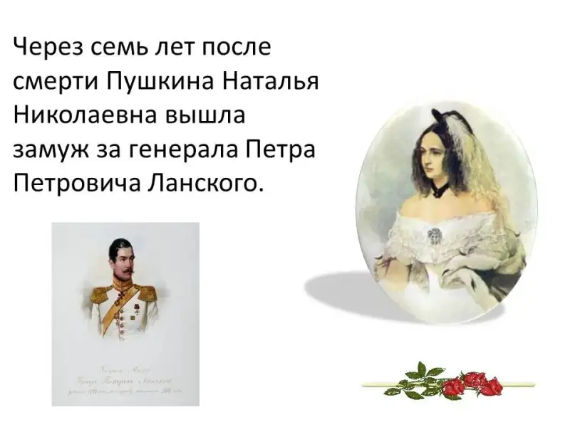 Ведущий: Только через семь лет после смерти Пушкина Наталья Николаевна вышла замуж за генерала Петра Петровича Ланского.