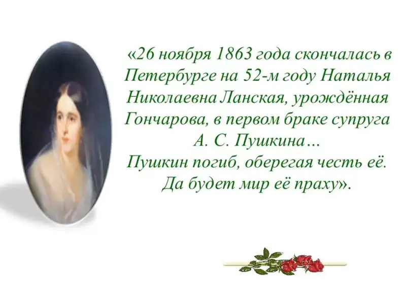 Ведущий: 26 ноября 1863 года Наталья Николаевна Ланская скончалась в Петербурге на 52-м году жизни.