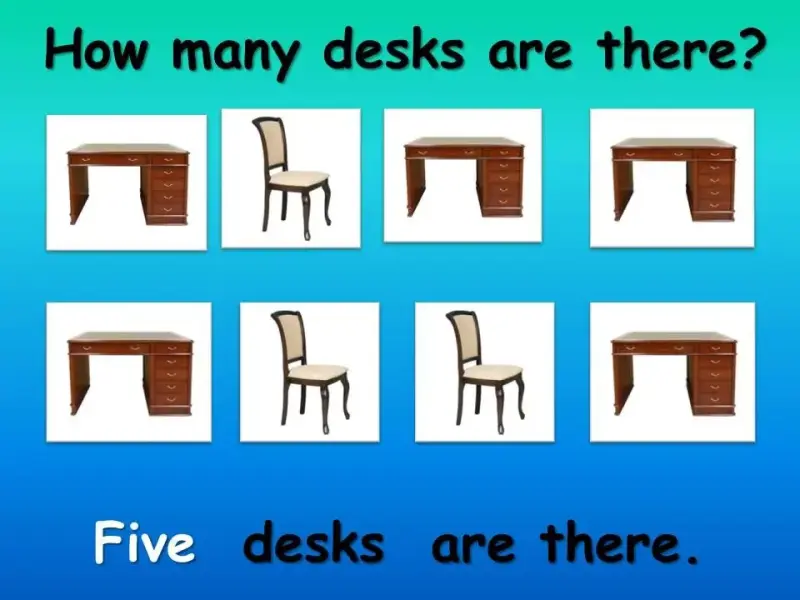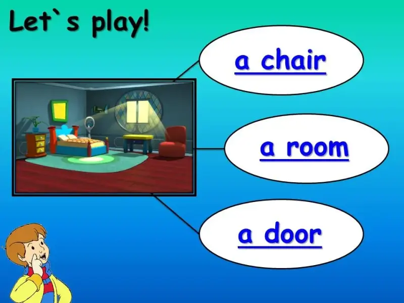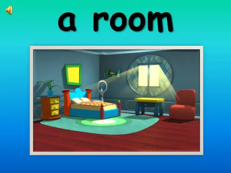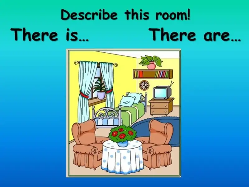 (На экране появляется слайд c изображением комнаты, конструкции There is/ there are) (слайд 37)