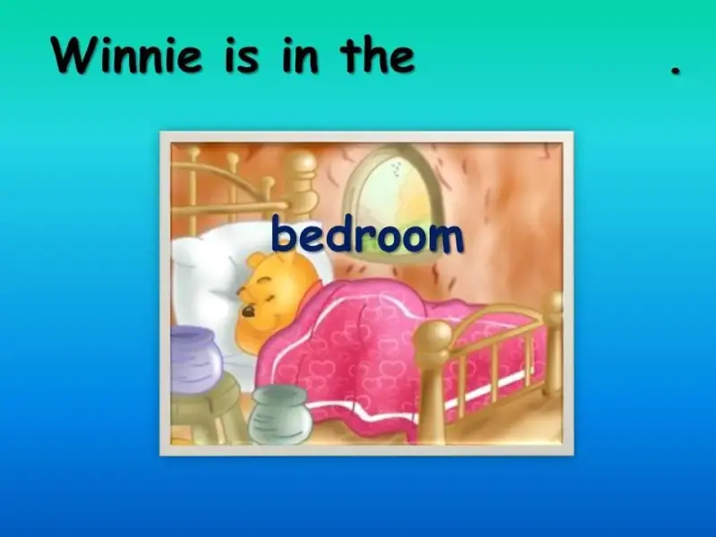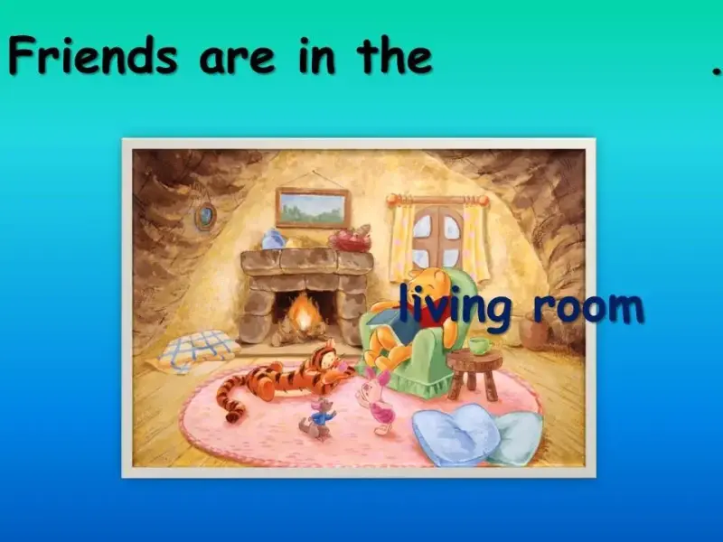 Слайды 33-36. При помощи заданий на этих слайдах проверяются знания детьми лексического материала. Персонажи мультфильма изображены в различных комнатах. Задача обучающихся прочитать часть предложения, дополнив его названием нужной комнаты.