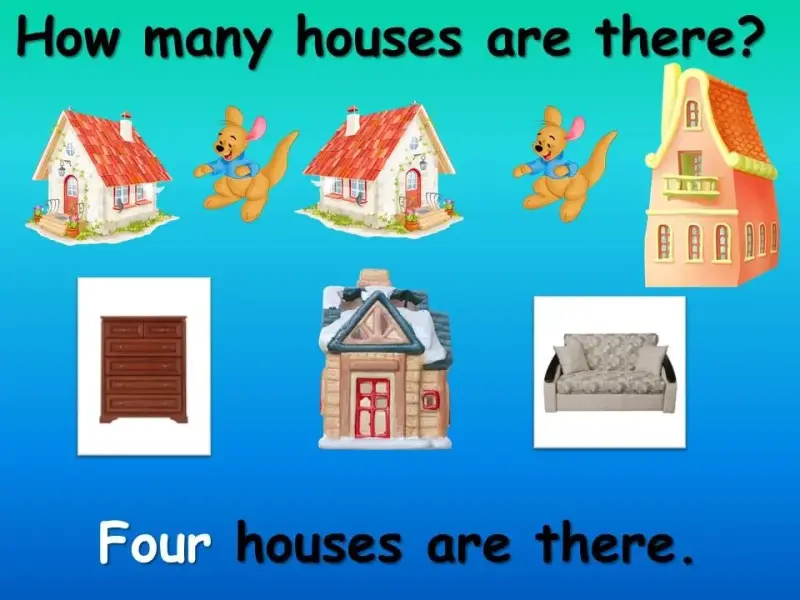 Учитель: Ok. Please, look at this picture (слайд) and say me how many houses do you see here. (pictures, pieces of furniture, etc.) (слайды 38-40)