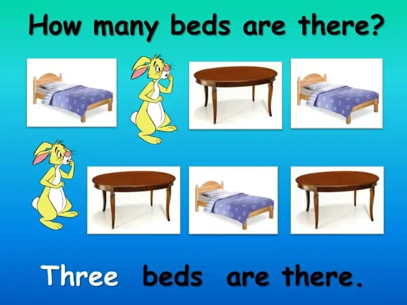 Слайды 38-40. Одной из задач данного урока является закрепление знаний по теме «Числа». Поэтому тема «Дом. Квартира. Мебель» поможет наглядно закрепить знание чисел детьми. Например, задается вопрос «Сколько кроватей здесь?» Дети отвечают, ниже появляется правильный ответ, и остается нужное количество предметов, лишние исчезают.