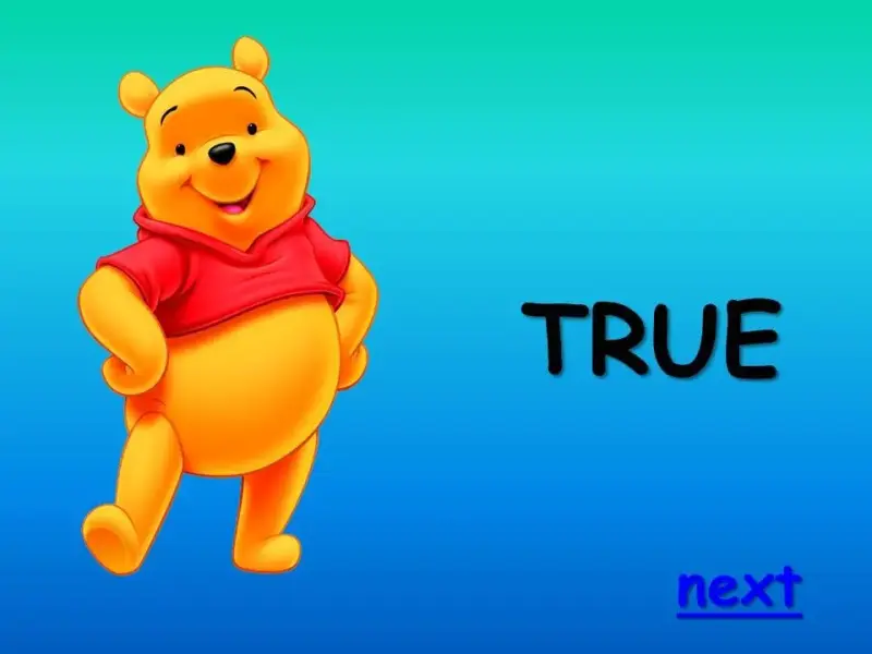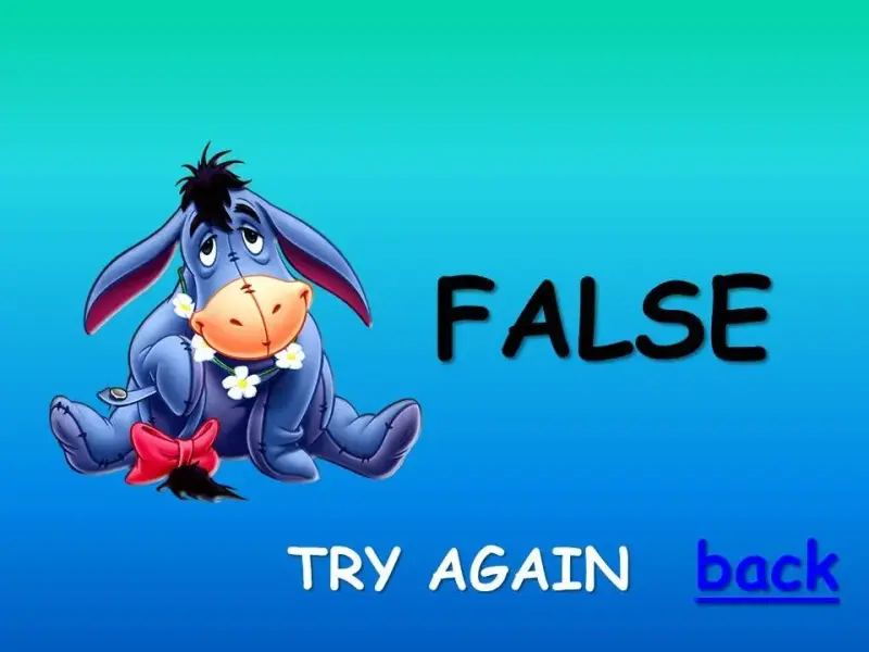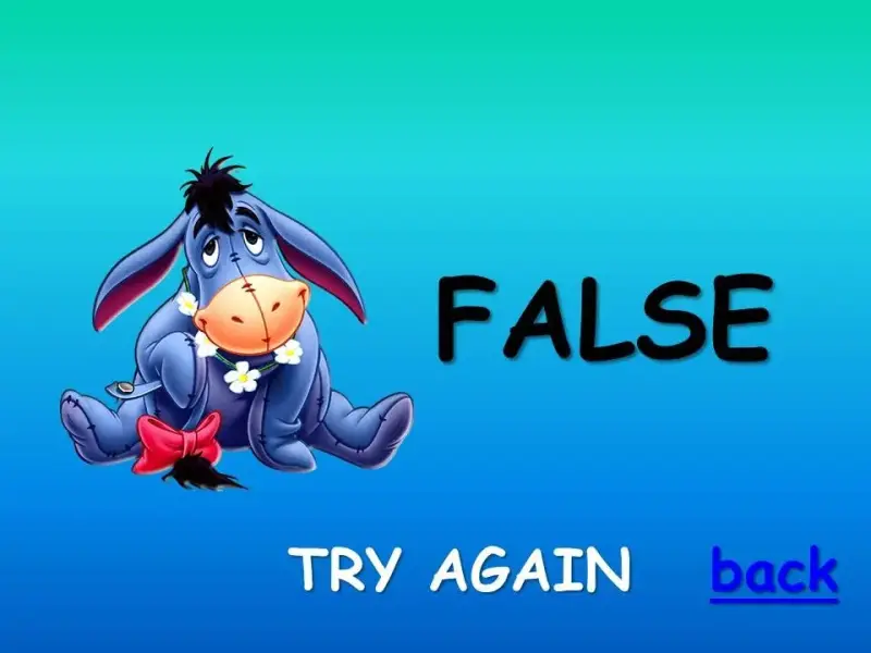 Слайды 25-31 используются учителем для проверки усвоенного лексического материала по теме. Для этого реализуются задания тестового характера. В данном задании использованы гиперссылки. При верном ответе обучающегося идёт переход на слайд с информацией о правильности выполнения задания (появляется изображение Винни - Пуха и слово TRUE). При этом идет ссылка с названием NEXT на следующий слайд. Если ответ ученика неверен, то появляется изображение Ослика, слово FALSE и фраза TRY AGAIN (Попробуй снова), а также ссылка BACK с возвращением на предыдущий слайд для повторного выполнения задания.