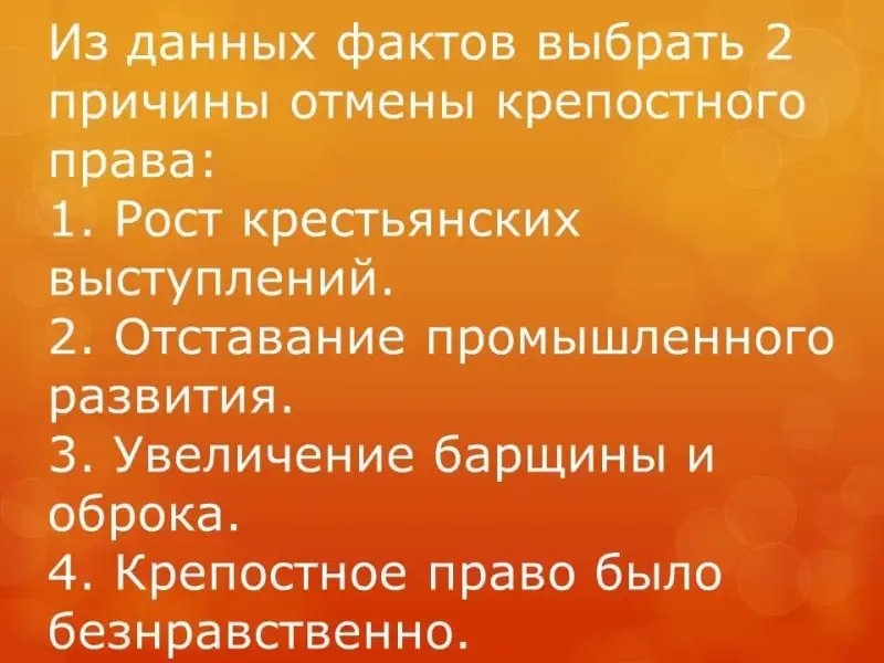 Одним из домашних заданий на предыдущем уроке было привести примеры произведений русской литературы, где проявляется тема крепостного права. Учащиеся приводят примеры следующих писателей: повесть А.С.Пушкина «Капитанская дочка», стихотворение А.С.Пушкина «Деревня», поэма Н.А.Некрасова «Кому на Руси жить хорошо», роман Н.В.Гоголя «Мёртвые души» и другие произведения. В заключение урока учащиеся отвечают на вопрос: «Почему Александр II отменил крепостное право?», используя содержание лекции и другие дополнительные источники, делают вывод о том, что за отмену крепостного права выступали даже ближайшие родственники Александра II, которые были убеждены в необходимости проведения масштабных реформ и обеспечении гражданских прав и свобод населению.