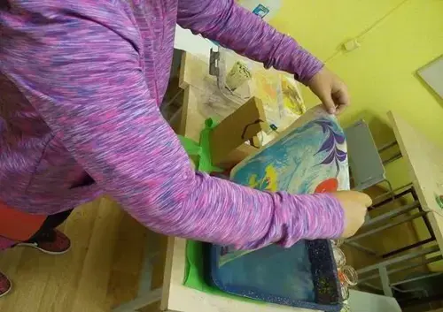 Важно сказать ребятам о том, как происходит процесс просушки рисунка. Рисунок сохнет в естественных условиях. Сначала он имеет желеобразную фактуру и является влажным. Поэтому необходимо положить его на пластиковую поверхность, чтоб он не прилип и одновременно подсох. Обращаться с таким рисунком следует очень аккуратно, чтоб не порвать бумагу. Это необходимо продемонстрировать детям.