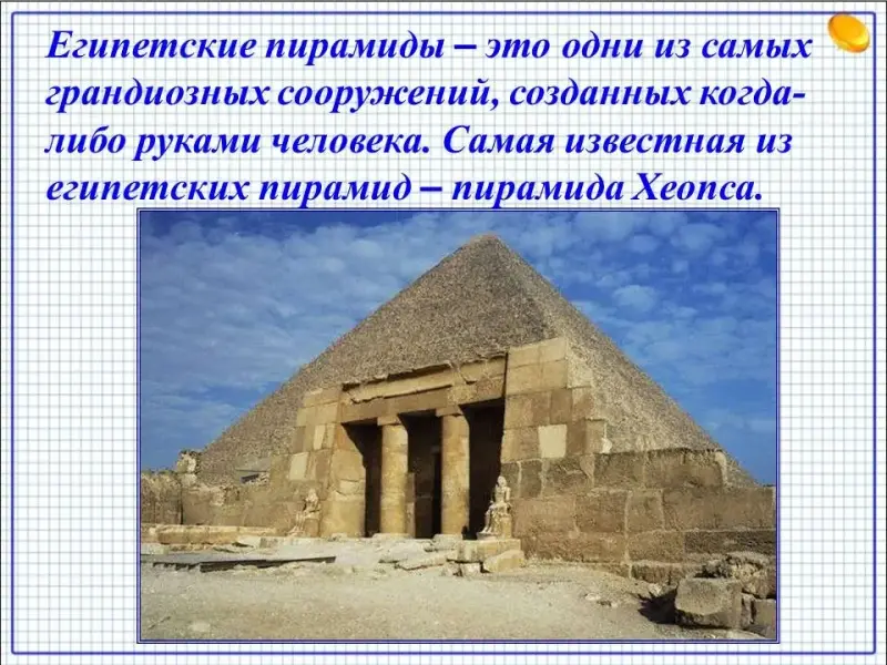 Египетские пирамиды - это одни из самых грандиозных сооружений, созданных когда-либо руками человека. Самая известная из египетских пирамид - пирамида Хеопса.
