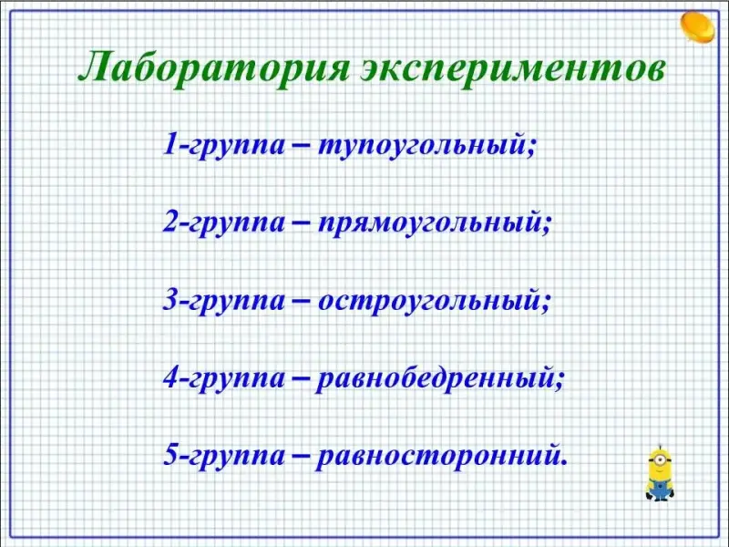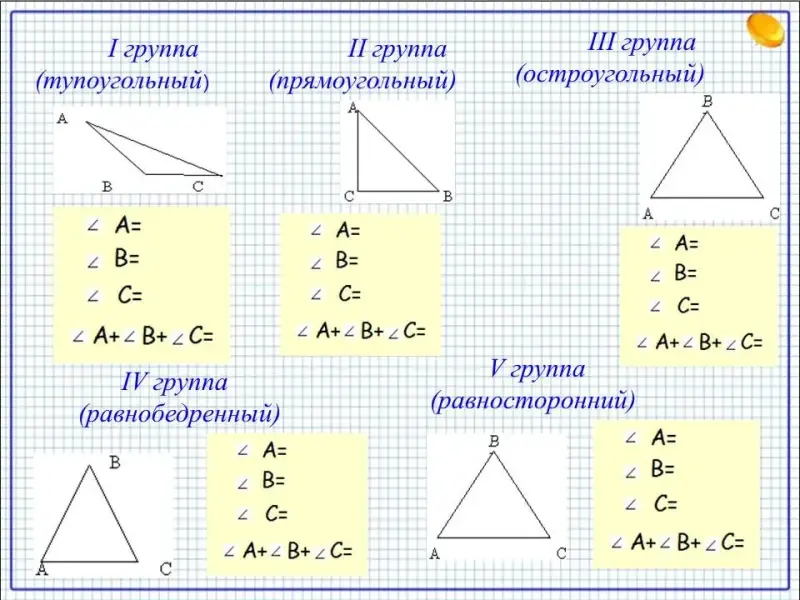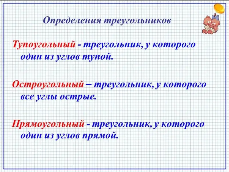 Полученные треугольники можно назвать: тупоугольными, прямоугольными и остроугольными.