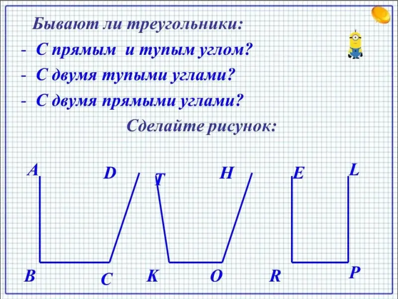 - Бывают ли треугольники с прямым и тупым углом? С двумя тупыми углами? С двумя прямыми углами? Сделать рисунок. К доске выходит ученик и выполняет следующие рисунки:
