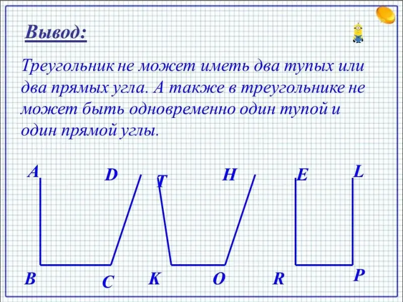 - Делают вывод, что треугольник не может иметь два тупых или два прямых угла. А также в треугольнике не может быть одновременно один тупой и один прямой углы.