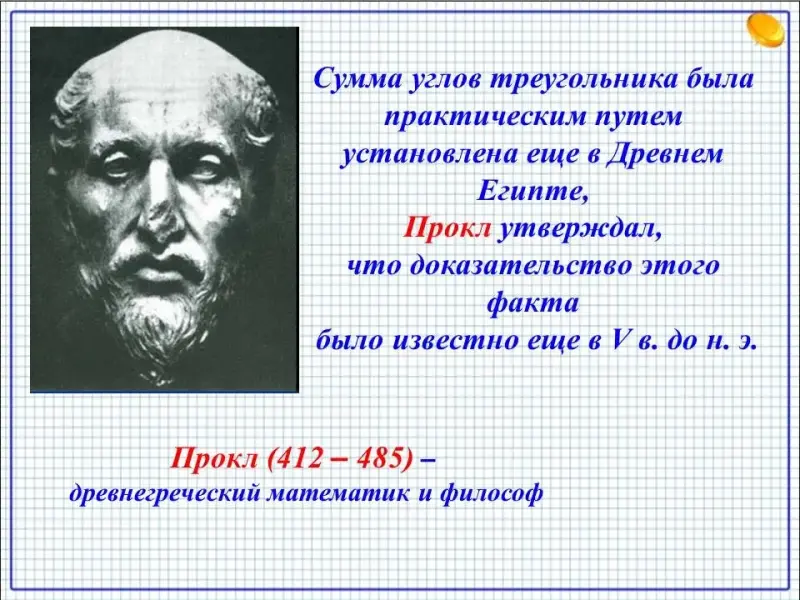 - Итак, ребята, у вас появилась гипотеза, сумма углов треугольника равна180°. Однако, у многих из вас получились результаты, близкие к 180°, но не 180°, Почему? Измеряя, мы получаем приближенные значения. Сумма углов треугольника была практическим путем установлена, вероятно, еще в Древнем Египте, Прокл утверждал, что доказательство этого факта было известно еще в V в. до н.э.