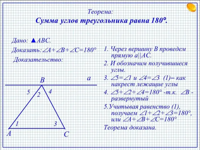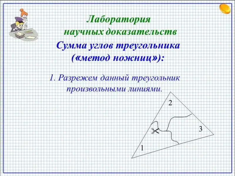 HI - с помощью исследовательской работы сформулировать и доказать теорему о сумме углов в треугольнике