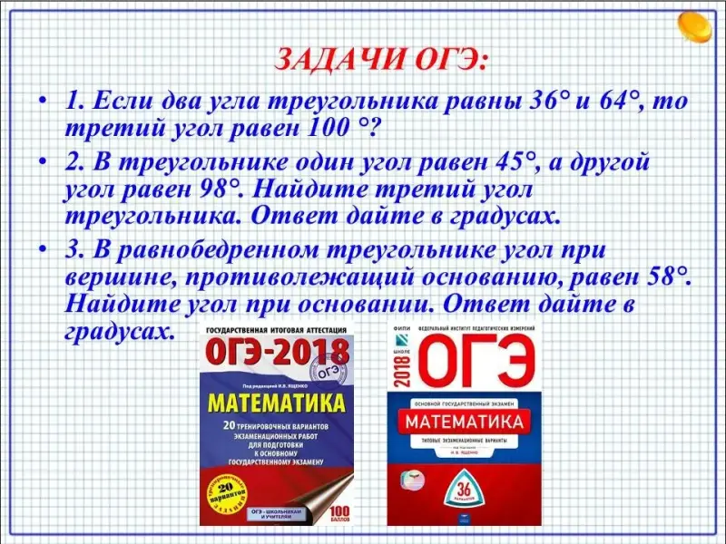 - Чему равен третий угол в треугольнике, если один из углов 40°, второй 60°? (80°)