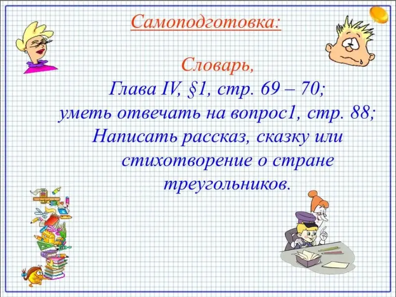 V. Самоподготовка. Словарь, Глава IV, § 1, стр. 69-70; уметь отвечать на вопрос 1, стр. 88; Написать рассказ, сказку или стихотворение о стране треугольников.