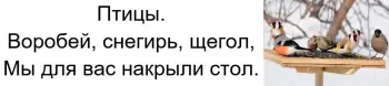 - Какие птицы с нами остаются зимовать? (воробей, снегирь, щегол)