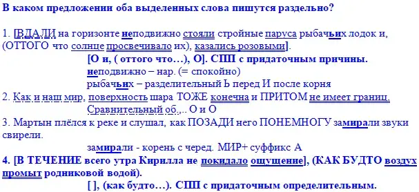 1. (В) ДАЛИ на горизонте неподвижно стояли стройные паруса рыбачьих лодок и, (ОТ) ТОГО что солнце просвечивало их, казались розовыми.