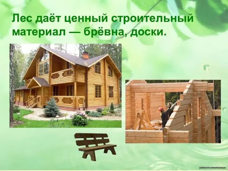 Лес даёт ценный строительный материал - брёвна, доски. Из стволов деревьев делают железнодорожные шпалы, подпорки для крепления подземных коридоров в шахтах. (Слайд 29)