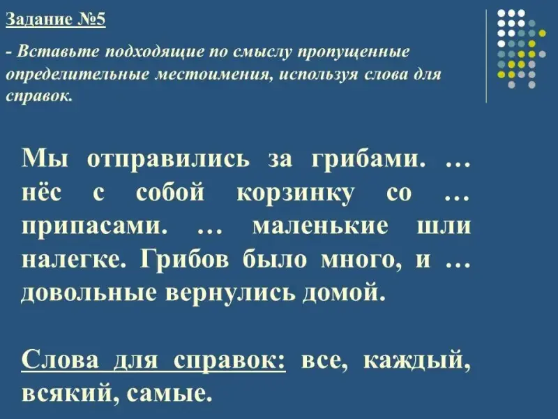 - Вставьте подходящие по смыслу пропущенные определительные местоимения, используя слова для справок.